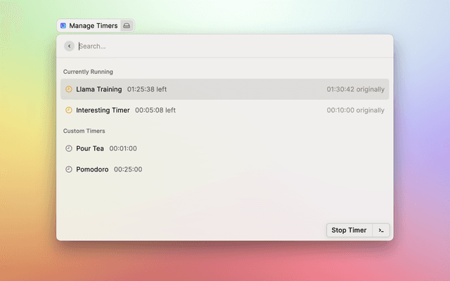 This is a lightweight extension allowing you to start and stop countdown timers, stopwatches, and alarms. It works directly in Raycast, no external apps or dependencies required.