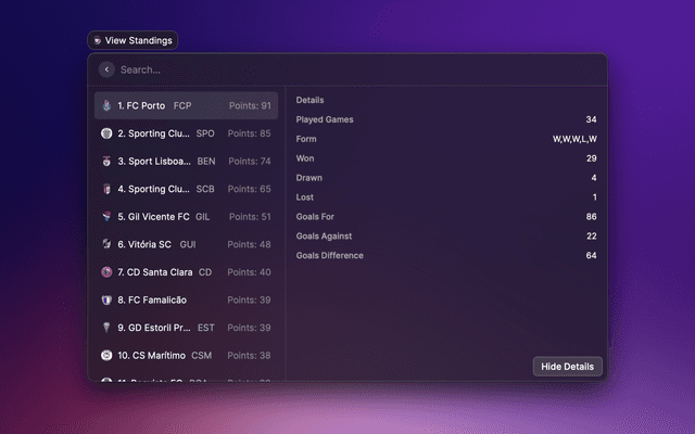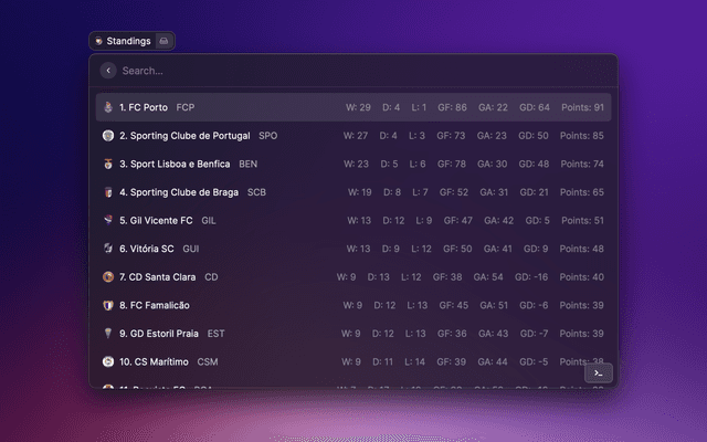 View the latest Premier League tables, form guides and season archives in Raycast.