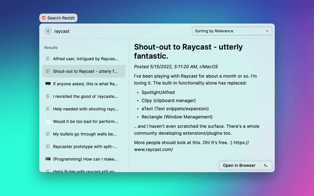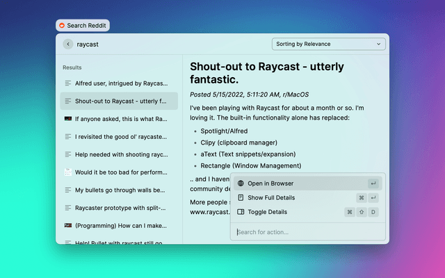 Raycast extension to search reddit.