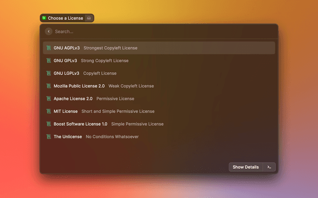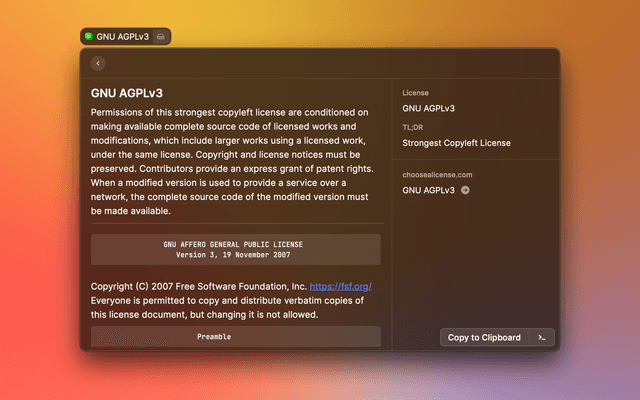 A Raycast extension for copying and pasting licenses for your open source projects.
